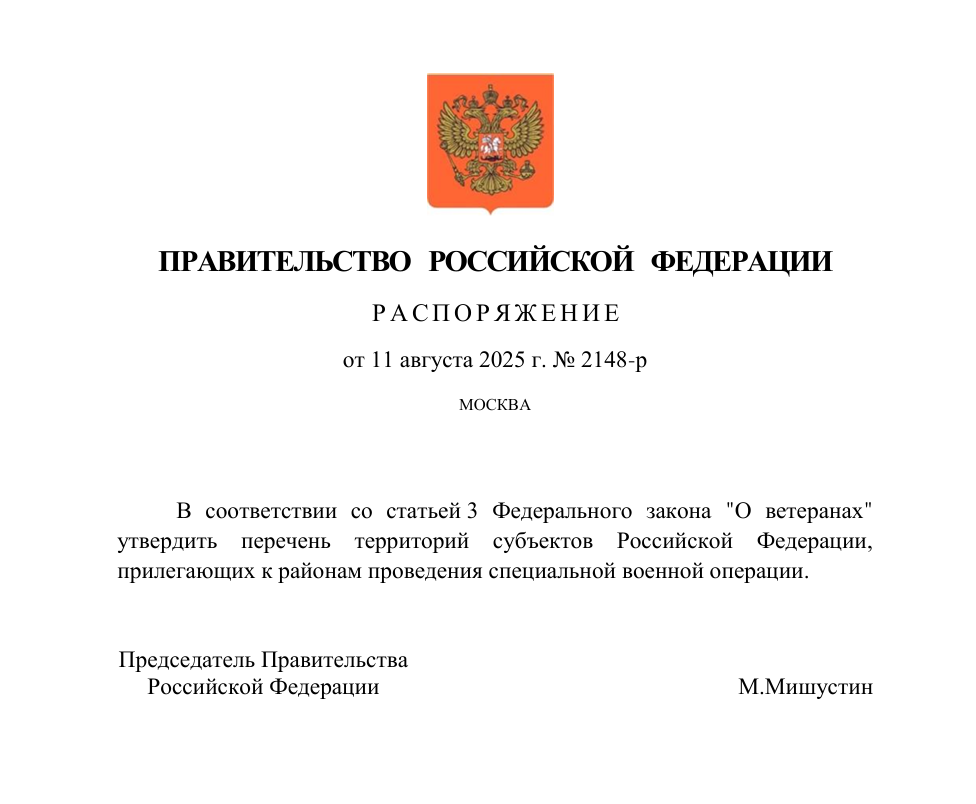 Распоряжением от 11 августа 2025 года №2148-р правительства РФ в перечень территорий, прилегающих к районам проведения специальной военной операции и подвергшихся атакам со стороны вооружённых формирований Украины, вошло 11 административно-территориальных образований.