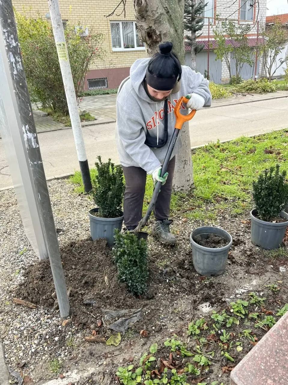На аллее проведено озеленение – высажены японские бересклеты «Бенкомасаки», фотинии Фразера «Ред Робин», чайно-гибридные розы и аризонские кипарисы.