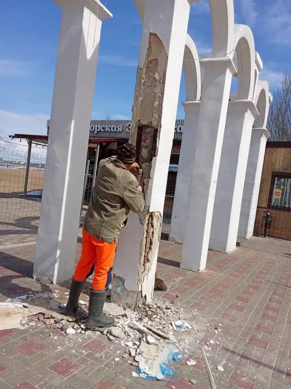 Арка — одна из узнаваемых архитектурных деталей Анапы. За зиму она местами разрушилась, потеряла облик. Сейчас специалисты зачищают повреждённые участки, после чего проведут её полное восстановление.
