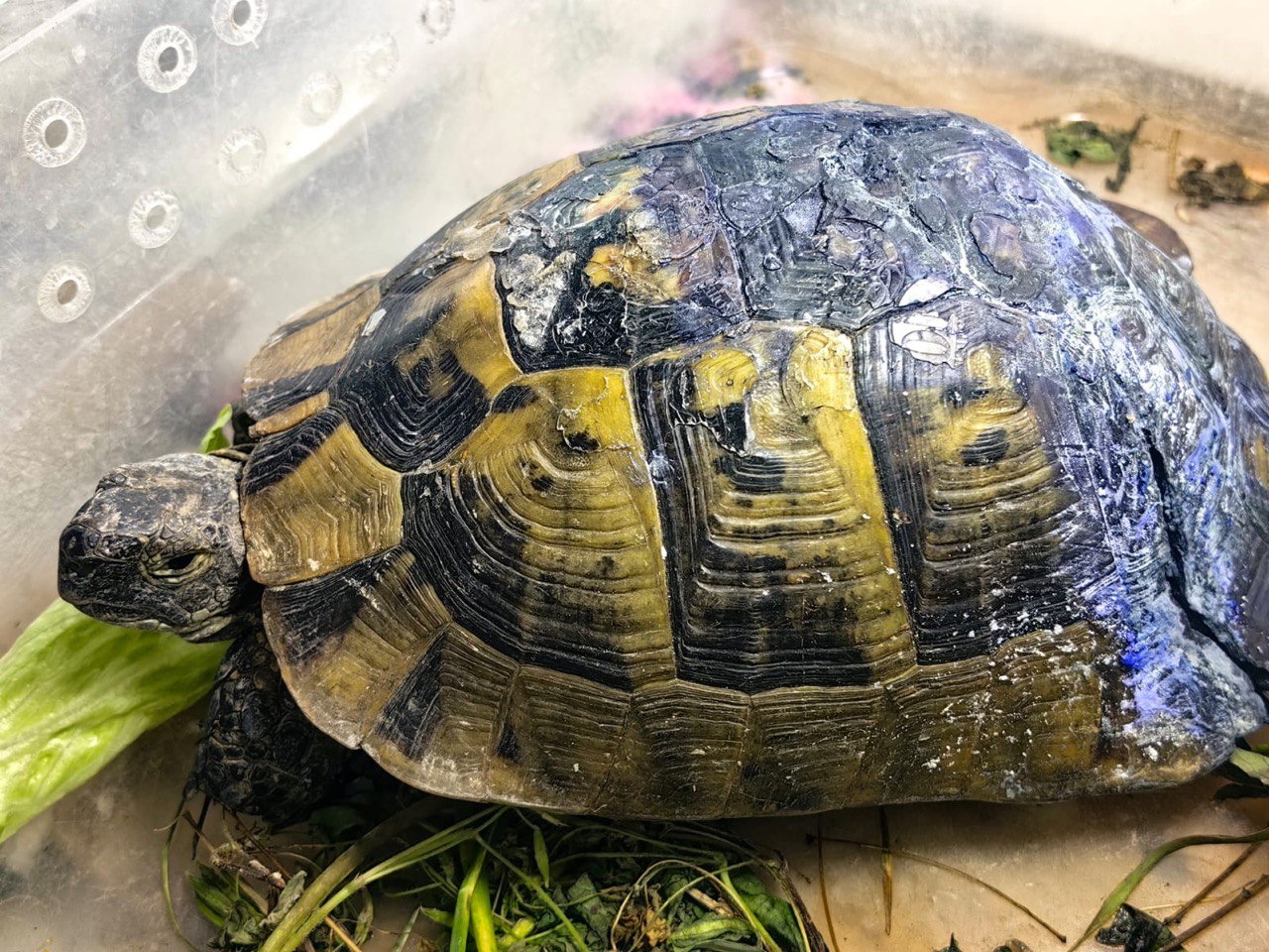 «Своим панцирем черепаха чувствует даже прикосновение травинки. Ей очень больно. Она вся в клею, но сейчас снимать клей нельзя, у нее везде раны. И ее бросили умирать такой мучительной смертью», – рассказала Светлана Гурашкина, руководитель центра реабилитации черепахи Никольского.