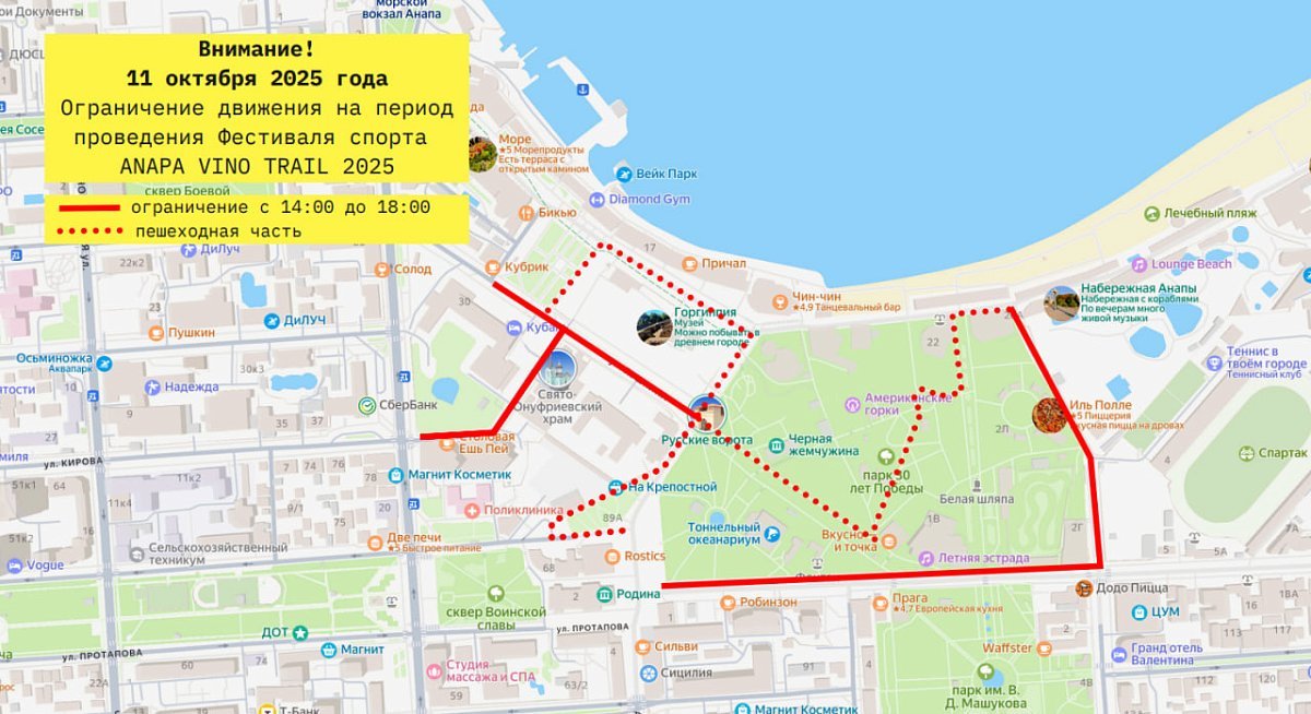 Это касается некоторых улиц на время проведения спортивного фестиваля «Анапа вино трейл» с 10 по 12 октября.