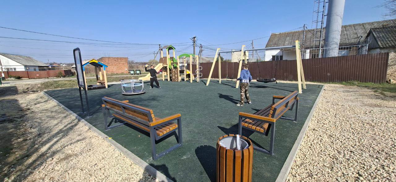 Площадка оснащена безопасными и современными игровыми комплексами. Расположена она по улице Мира, 5, рядом с местным клубом.